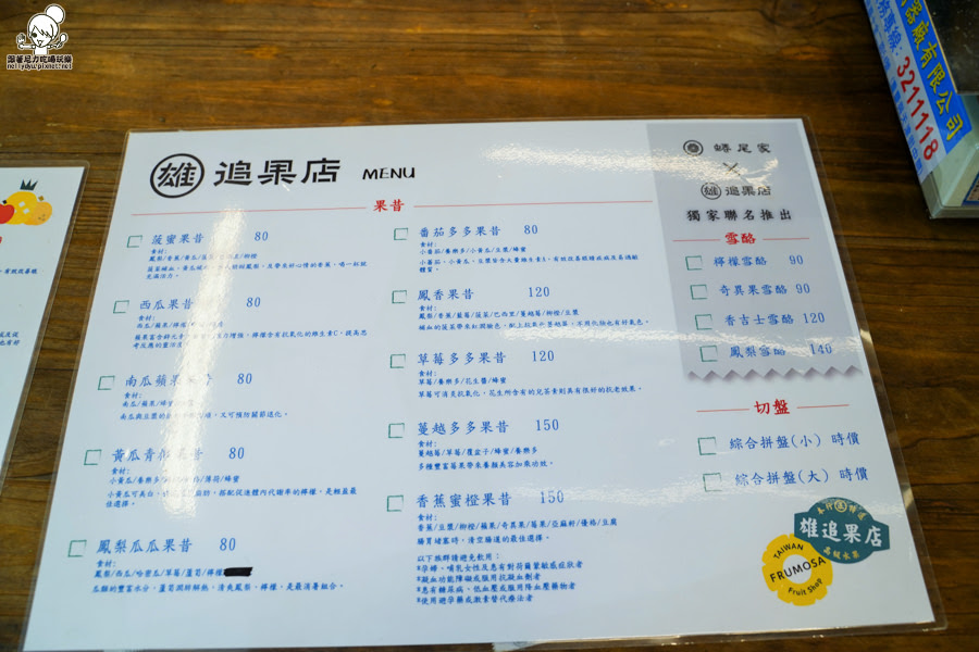 很多水果果昔可以挑選,還有與蜷尾家合作的雪酪(但我們沒點)