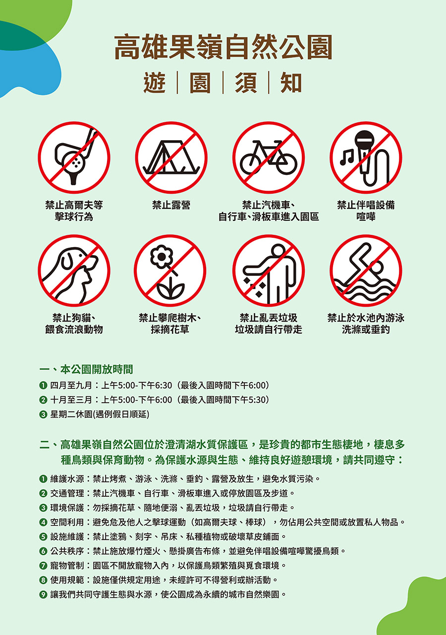 並禁止露營、釣魚、游泳及破壞植栽等行為