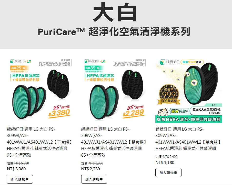 熟悉的大品牌 Dyson、LG、Honeywell、Coway等等濾網都有做販售
