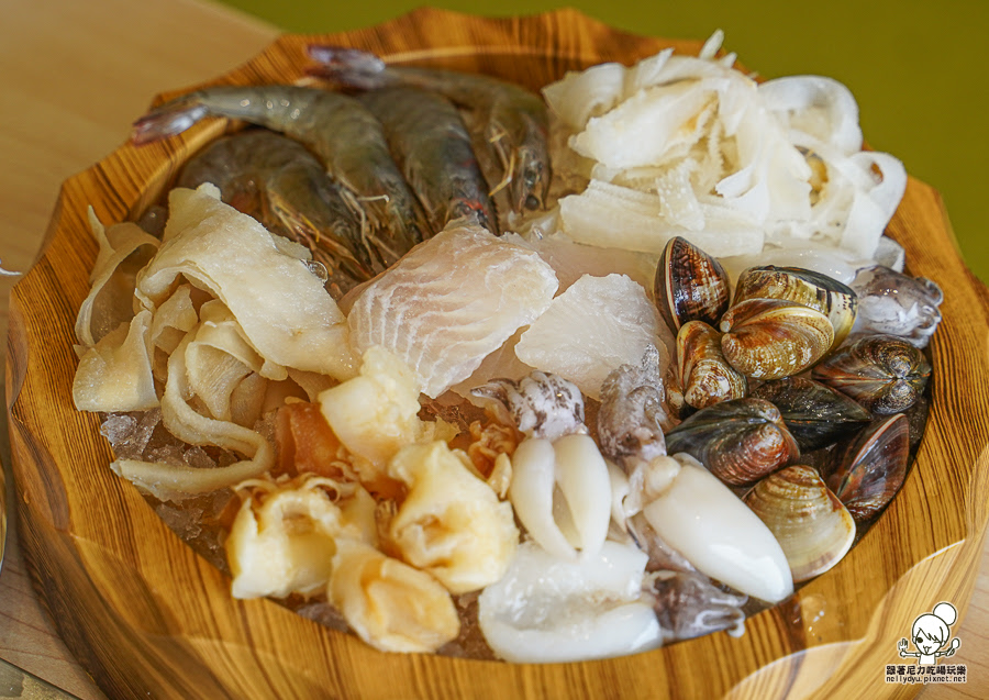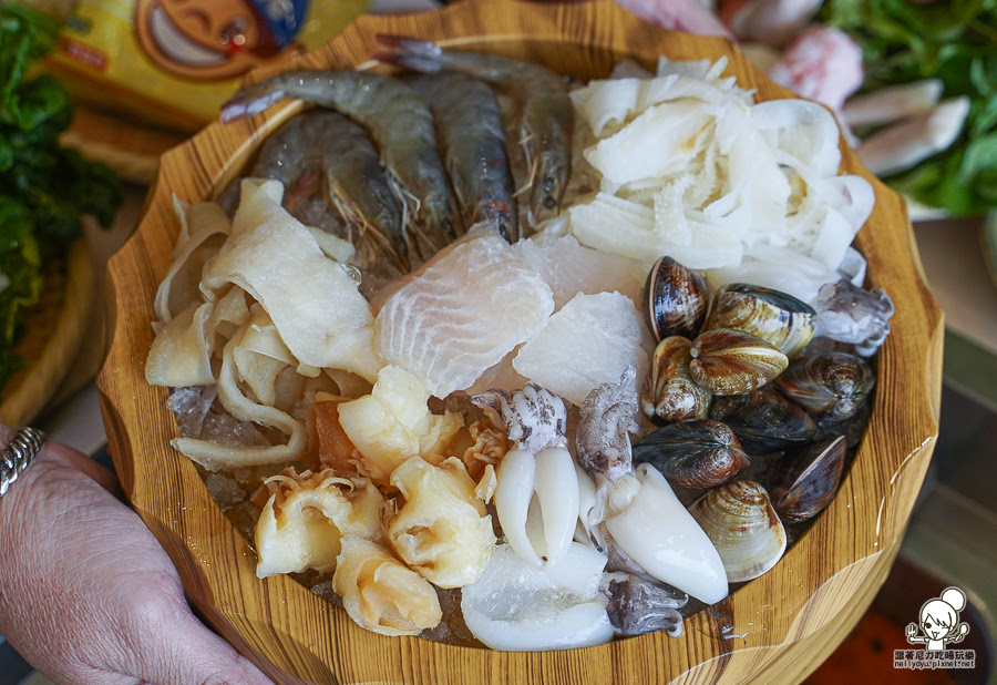 無毒白蝦、鮮甜蛤蠣、香脆鴨腸、手工花枝滑、軟嫩巴沙魚、鮮嫩牛百頁、珍味雪螺肉、QQ小花枝