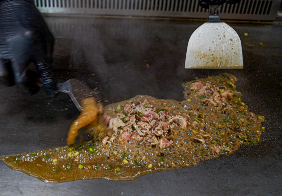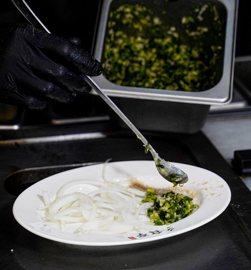 使用自家調配的醬汁,搭配洋蔥、蔥花爆香