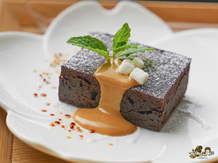 花心布朗尼是烤過熱的,淋上特製香濃的花生醬增加鹹甜滋味