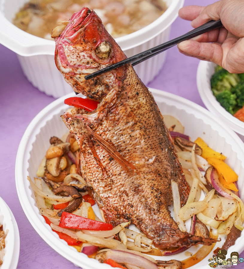 過年一定要有魚,使用新鮮活撈的紅雞母魚,加入秘製提味、大量蔬菜增添甜味