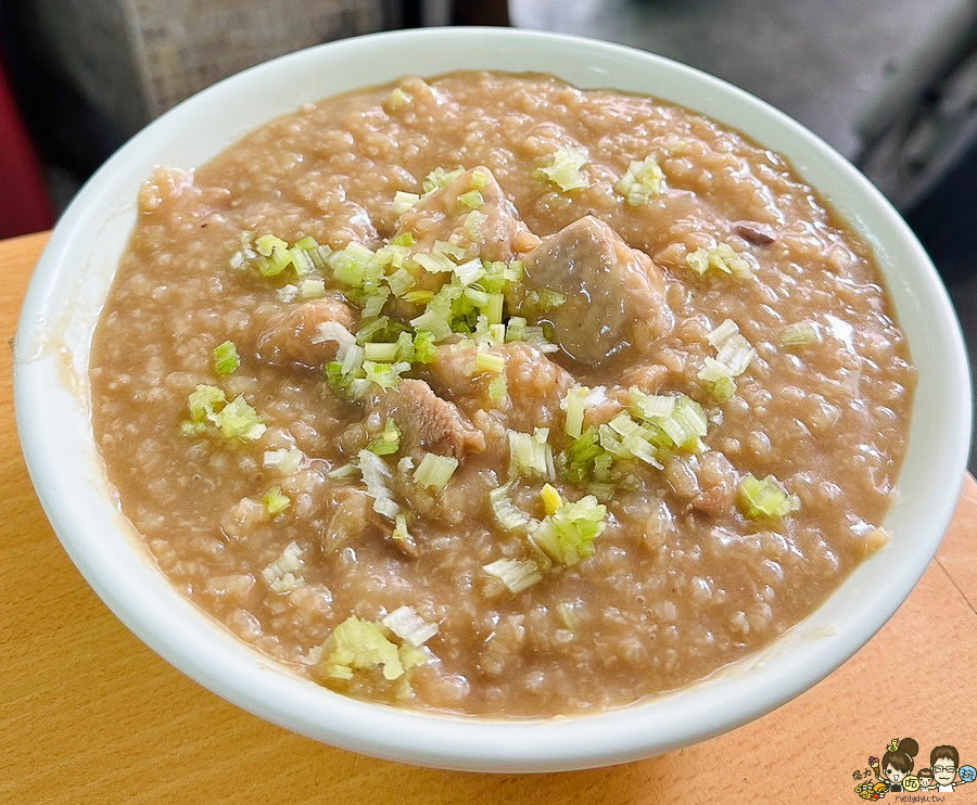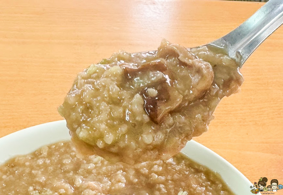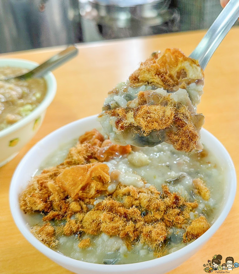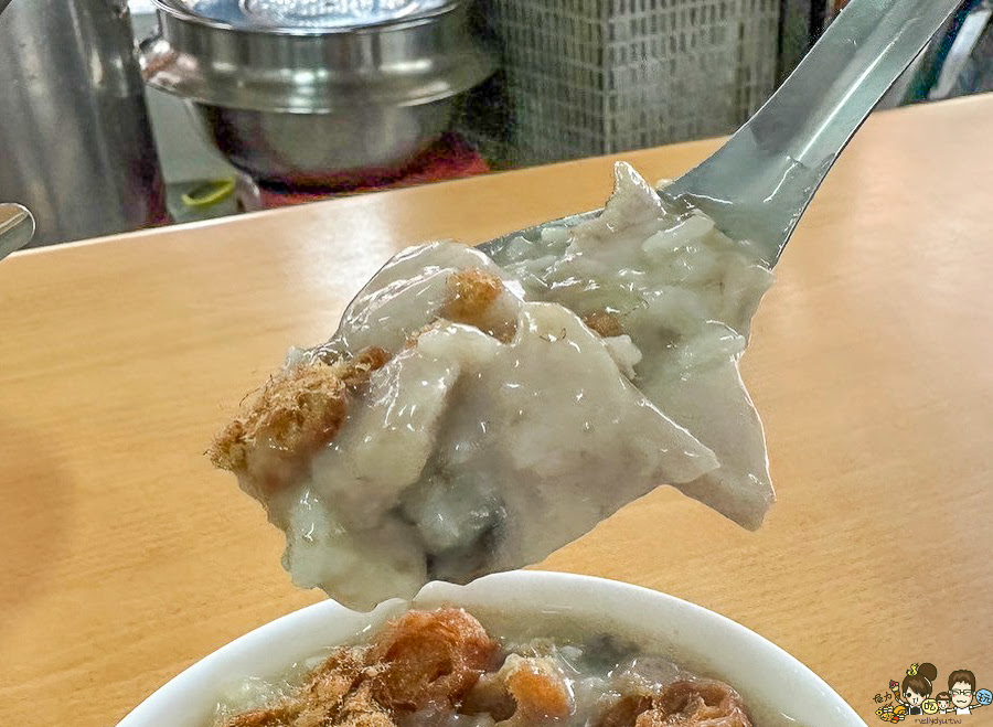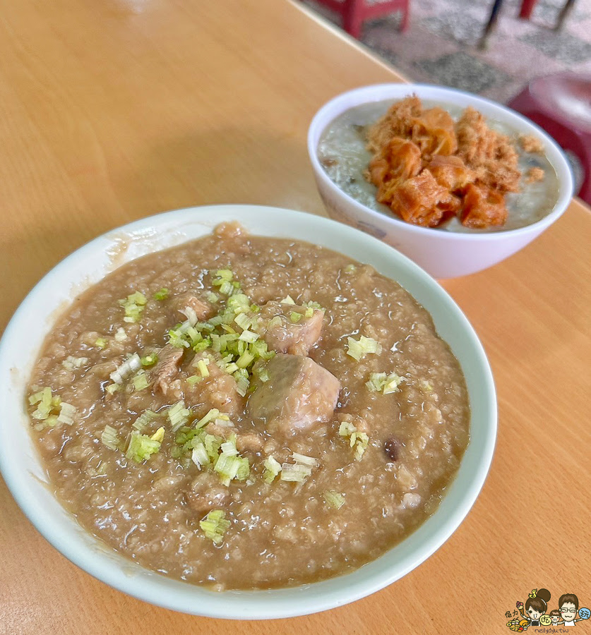 必須7點多才有的吃,大鍋子打開滿滿料,白粥都被燉煮到軟爛變色,香噴噴的氣味就是好吃的味道。