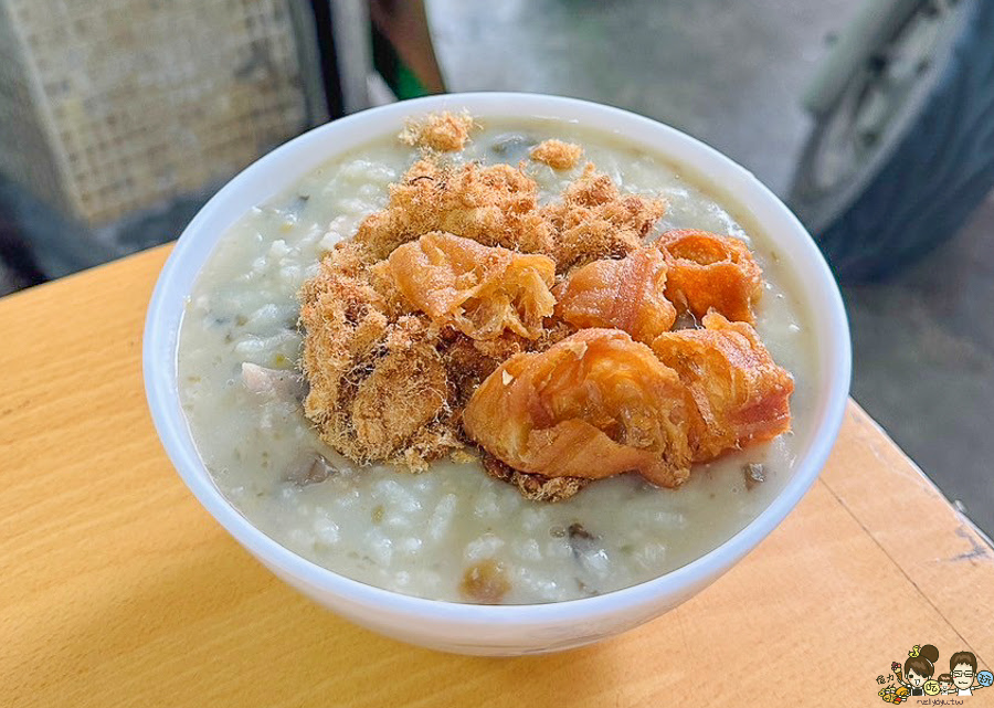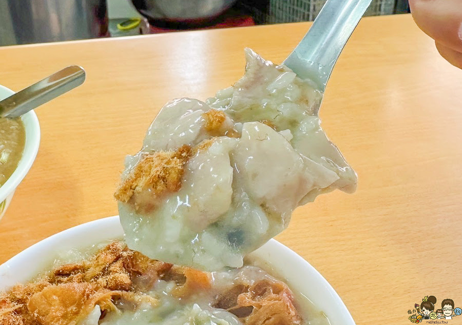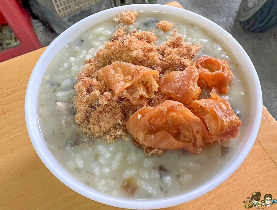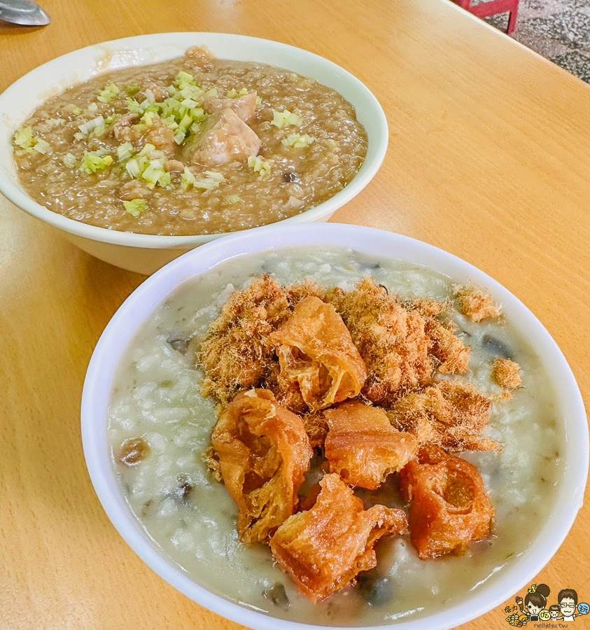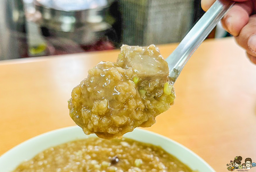 必須7點多才有的吃,大鍋子打開滿滿料,白粥都被燉煮到軟爛變色,香噴噴的氣味就是好吃的味道。