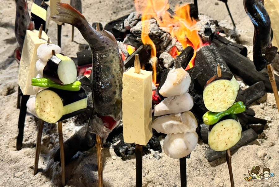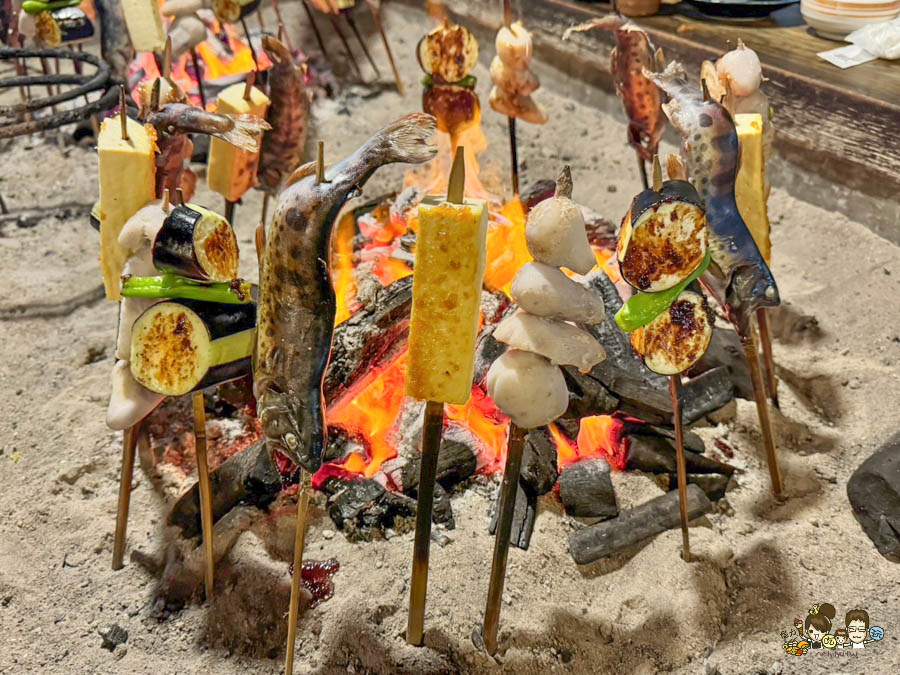 食材都會用竹籤串上,服務人員會教導該如何烤