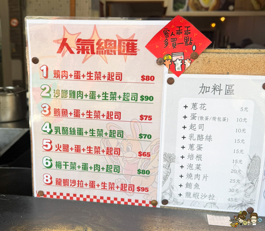 第一次可以參考人氣燒餅排行榜;生菜燒餅、芋見泥燒餅、肉蛋燒餅、起司蛋燒餅、蔥蛋燒餅