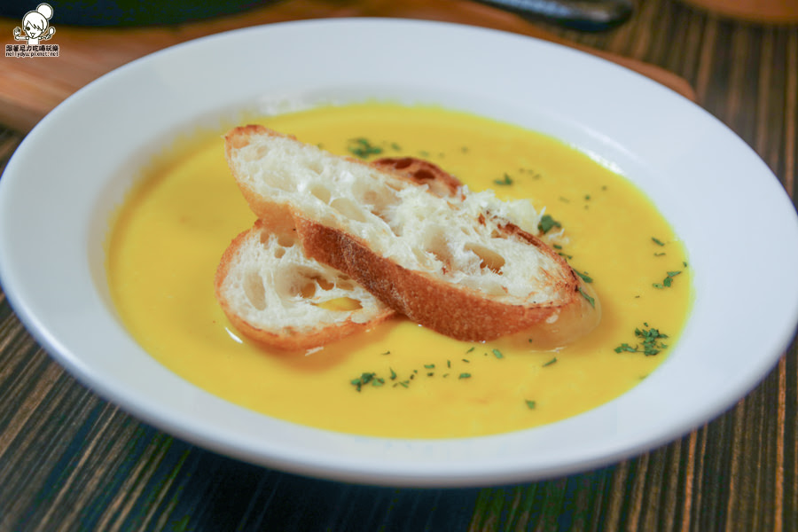 當天喝到的主廚例湯是法式蕃薯南瓜湯,很濃稠湯頭
