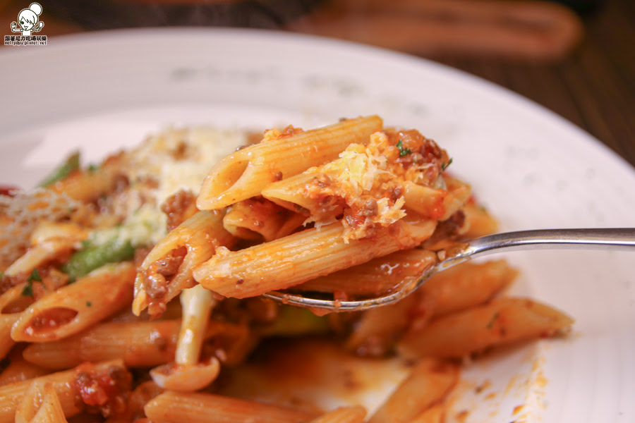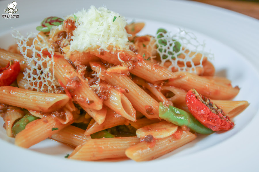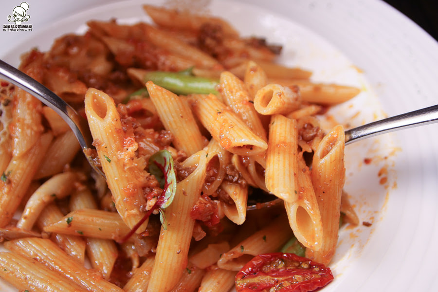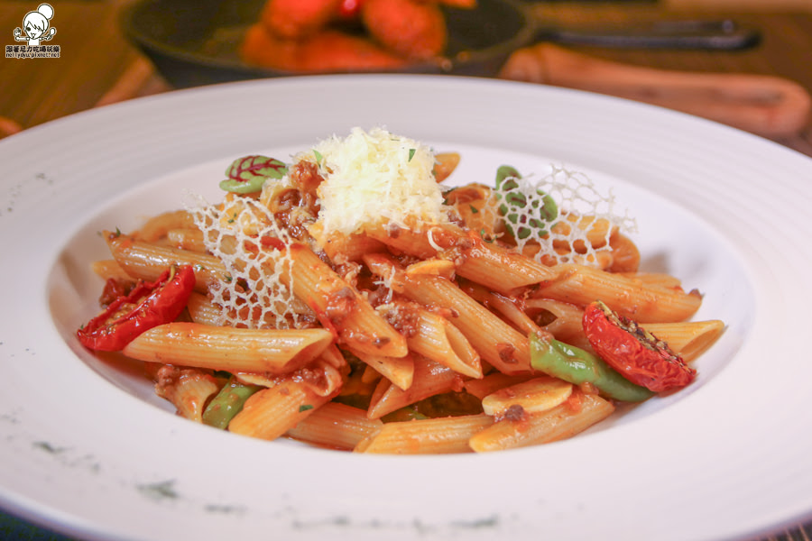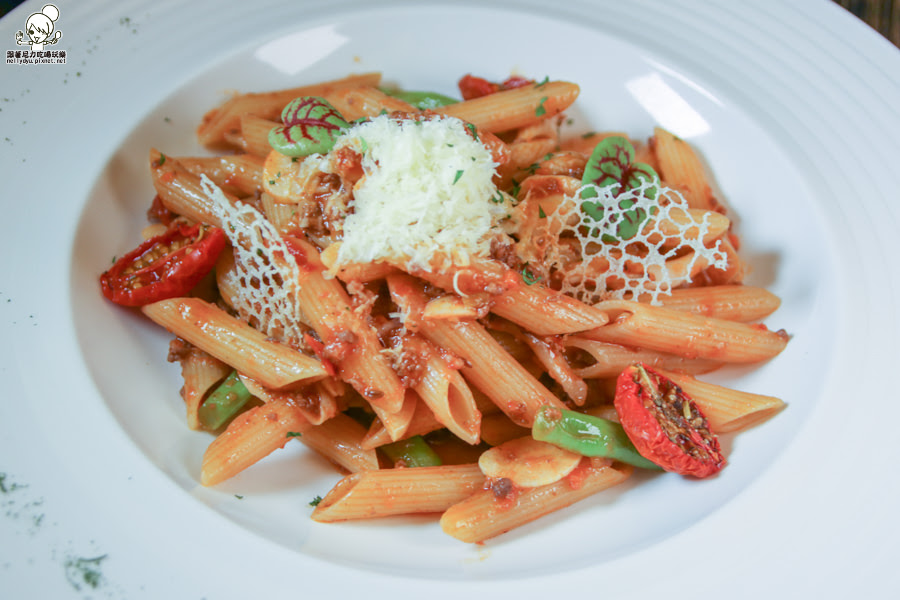 使用紅酒燉煮的肉醬義大利麵,筆尖麵裡面會藏有香氣與肉醬