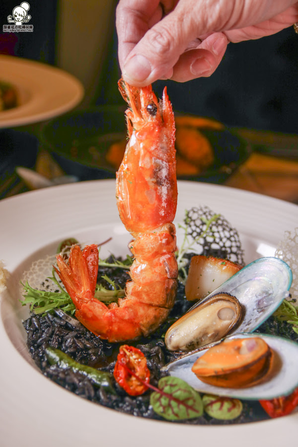 海神波賽東燉飯(天使紅蝦、干貝、紐西蘭淡菜、墨魚汁燉飯)
