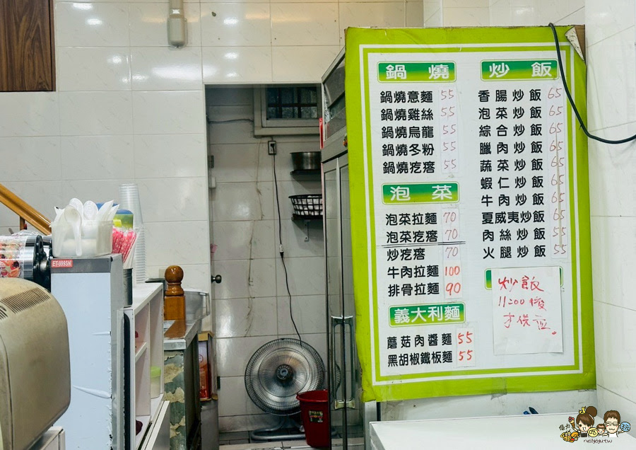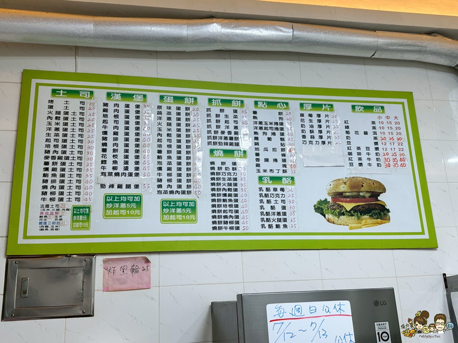 吐司、漢堡、燒餅、蛋餅、抓餅、鍋燒麵類還有11:00後供應炒飯