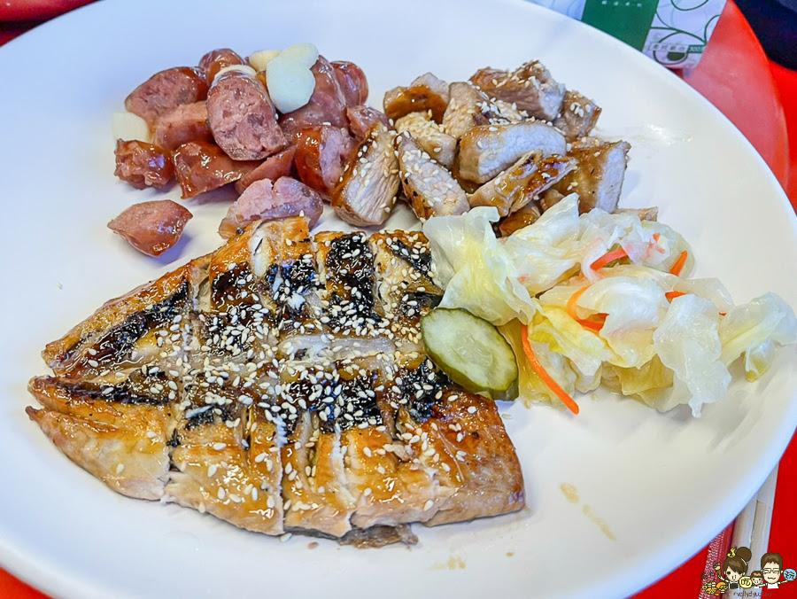 烤物拼盤,有招牌香腸、虱目魚肚、松坂豬肉