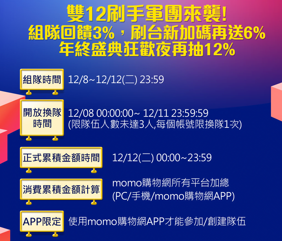 組隊賺紅利金時間:12/8(五)~12/12(二) 23:59