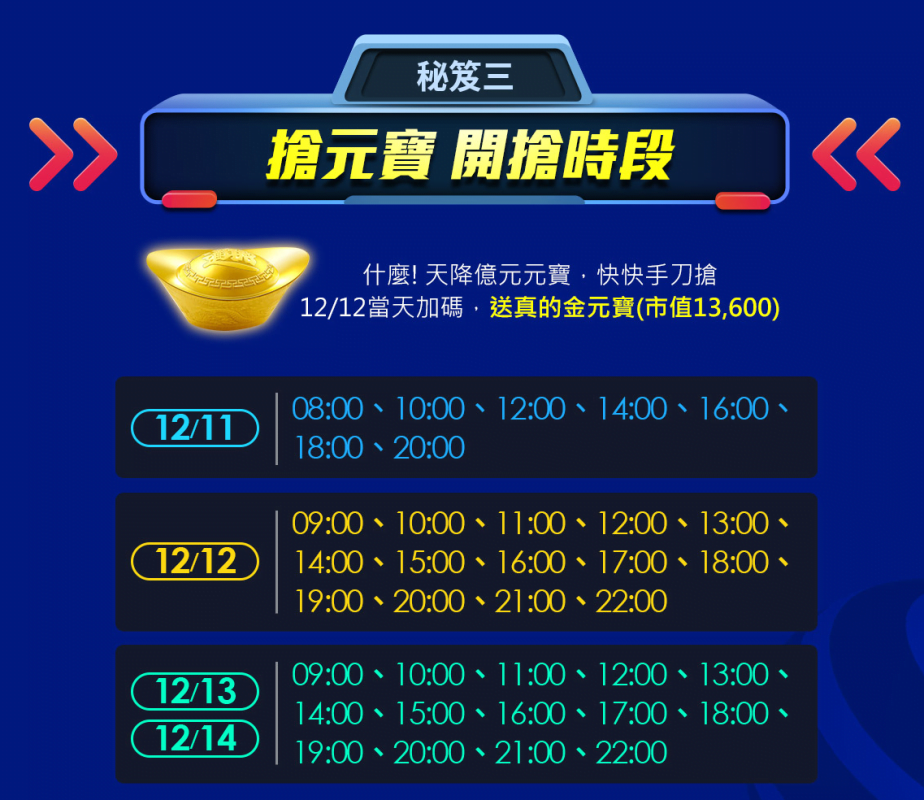 記得先設定鬧鐘,準備好頁面,就可以參與全站狂撒億元元寶