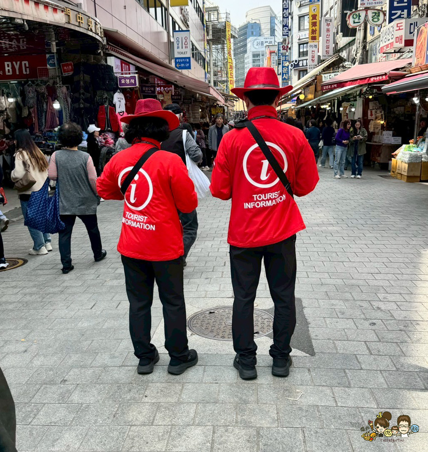 韓國首爾熱鬧的地區,都會看到穿紅色衣服的人員