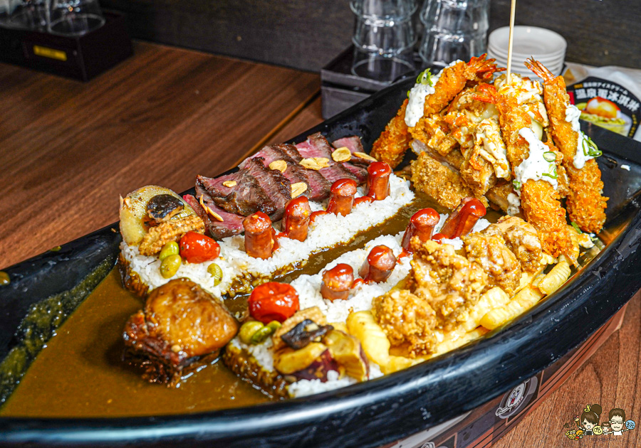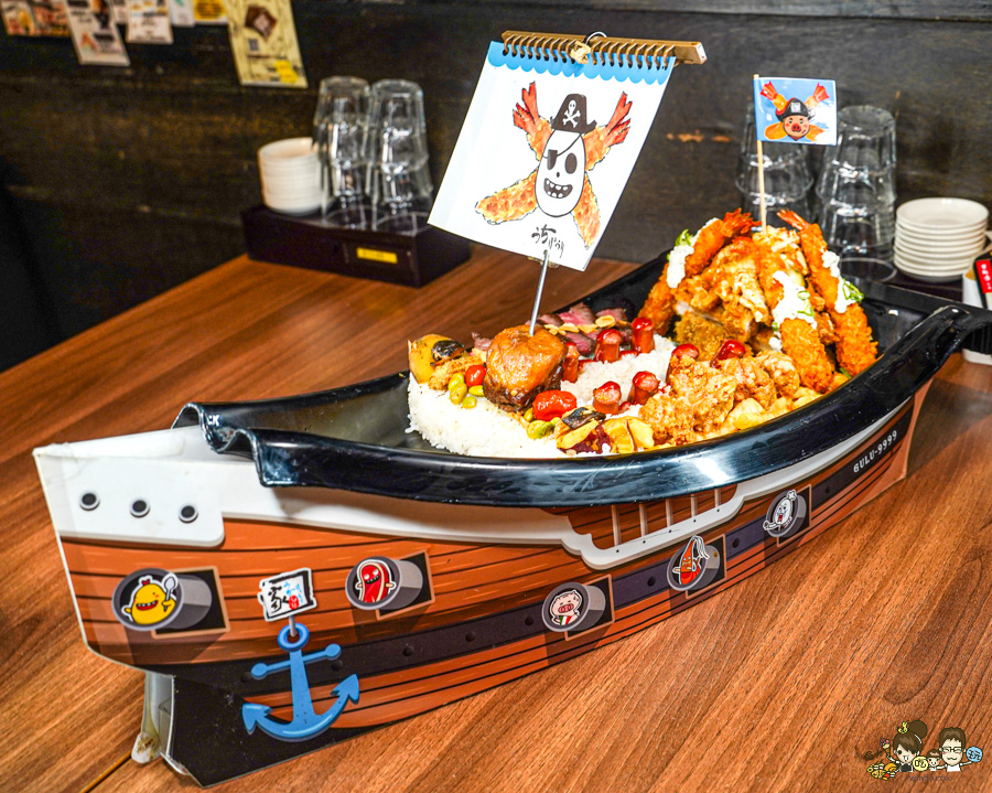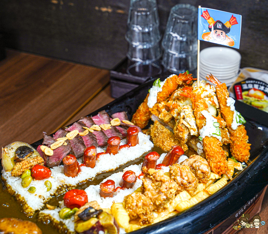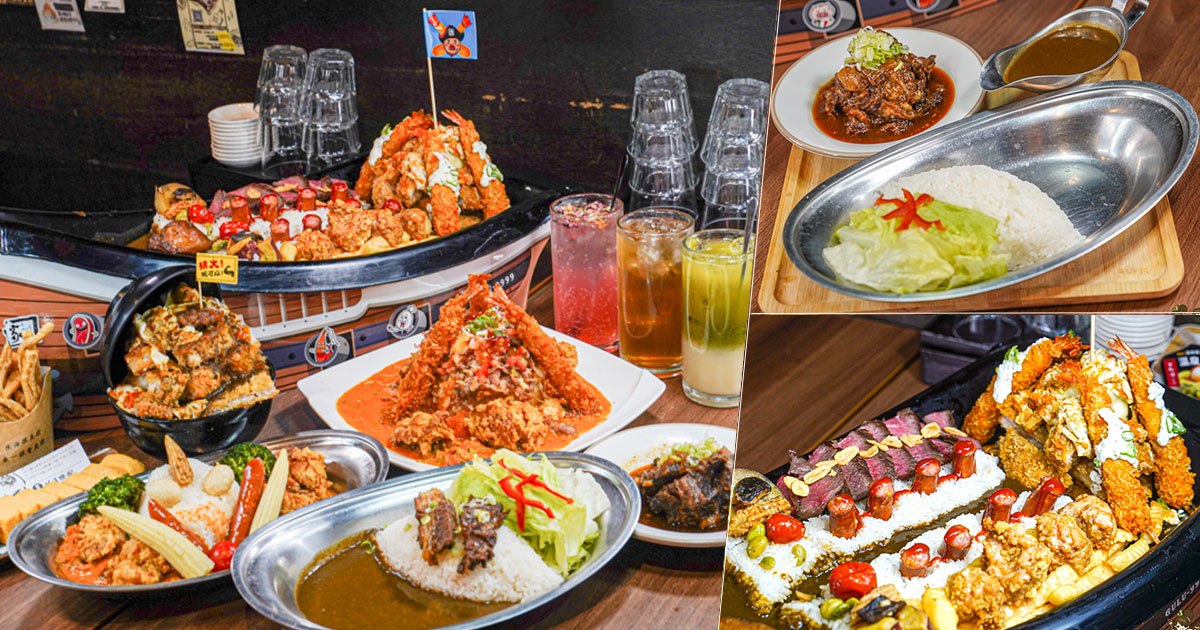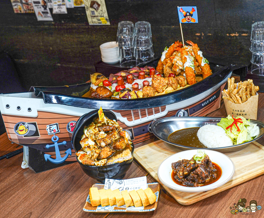 全台獨創船型器皿,裝載著爆量炸豬排、牛排、唐揚雞與義大利麵