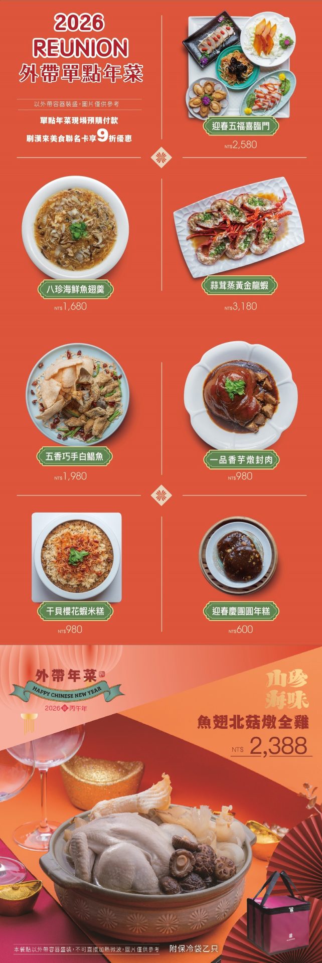 訂購全套年菜外帶均附保冷袋(持保溫帶回購可現折200元)