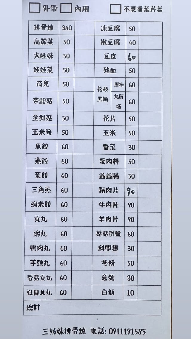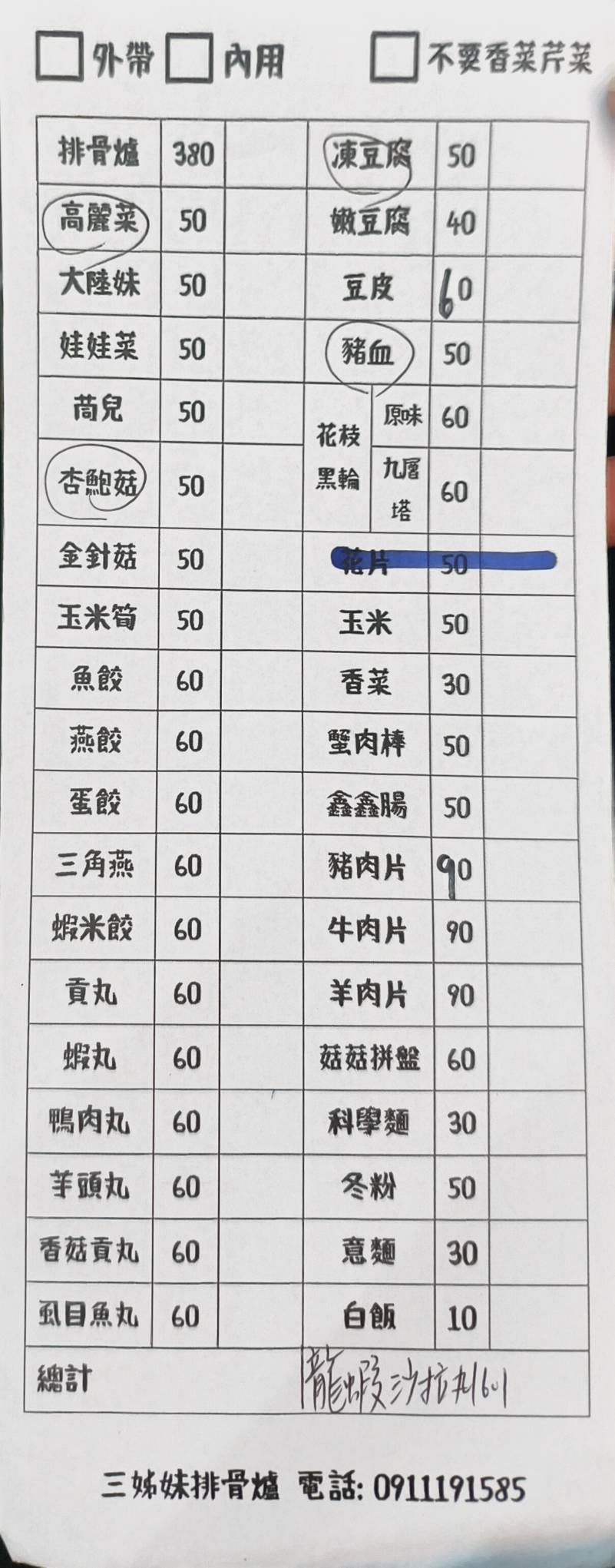 三姐妹排骨爐 菜單(價格依據現場為主)
