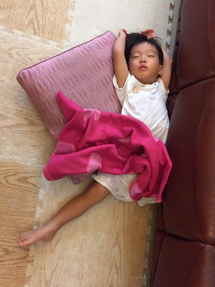 所以小泥巴每次玩累的,都可以很安心讓他在客廳的地板上睡覺