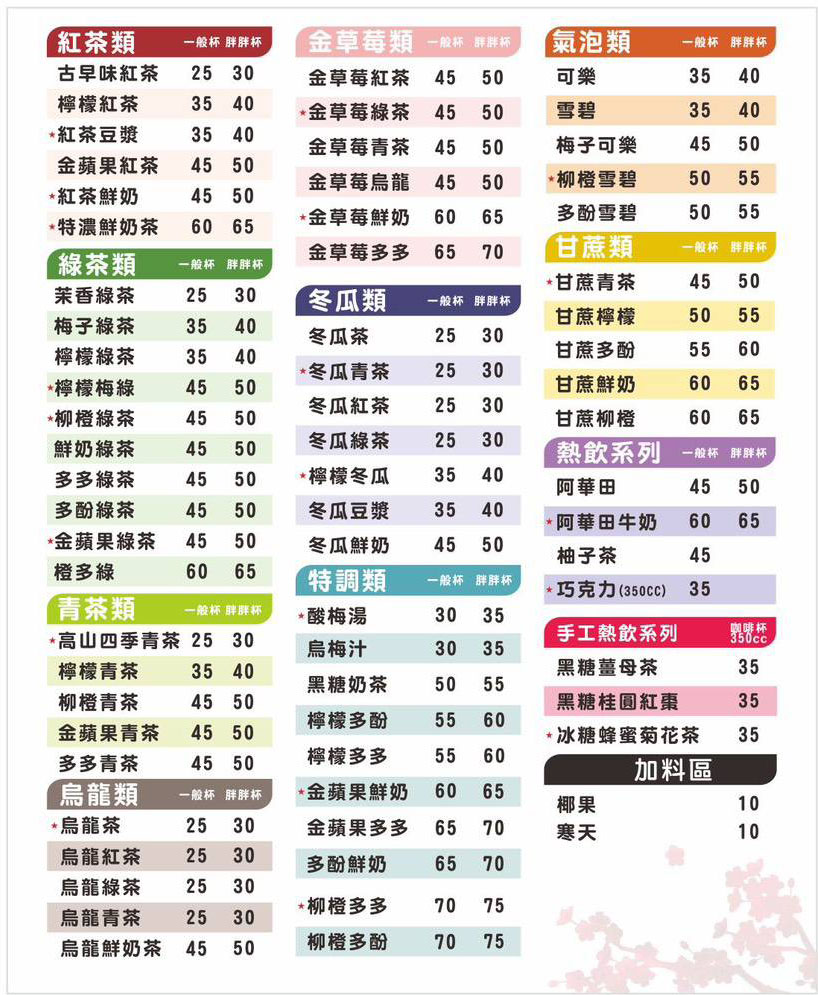 招牌必喝:紅茶鮮奶、紅茶豆漿、特濃鮮奶茶、高山四季青茶、冬瓜檸檬、甘蔗青茶、金蘋果鮮奶、金草莓多多