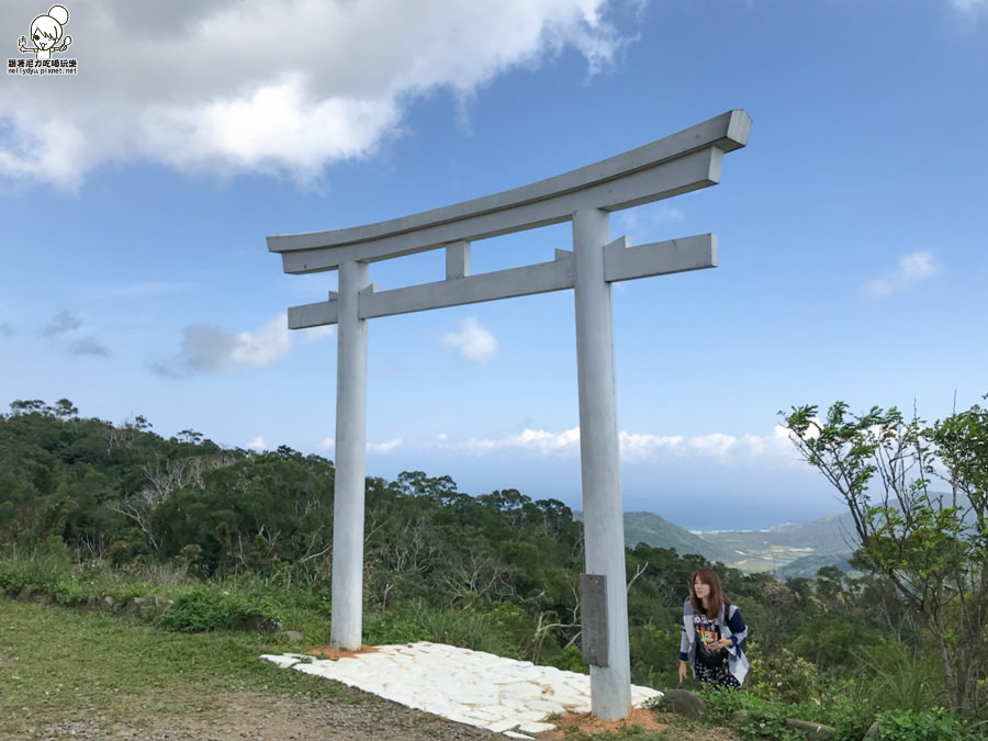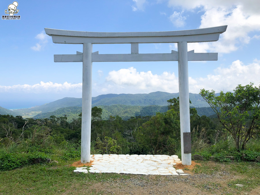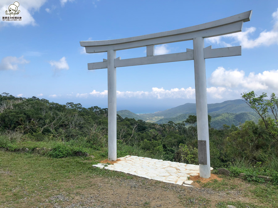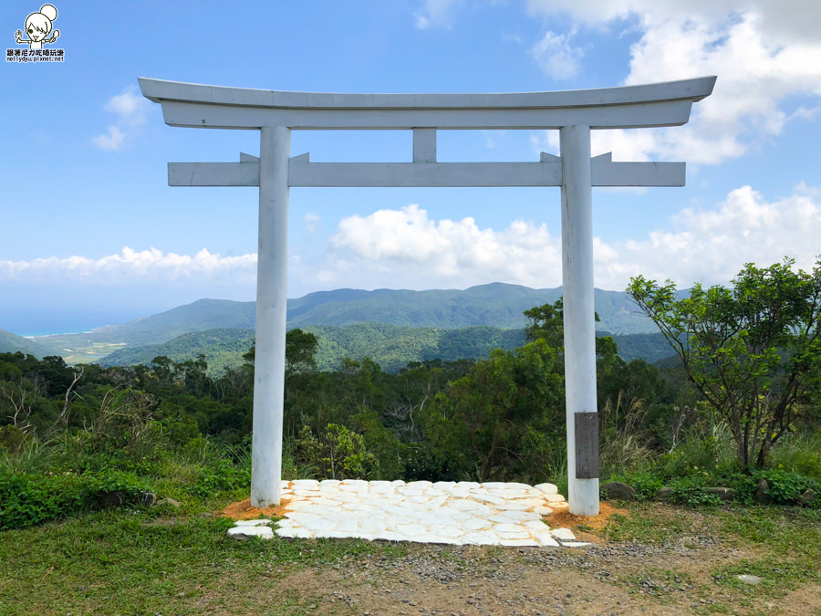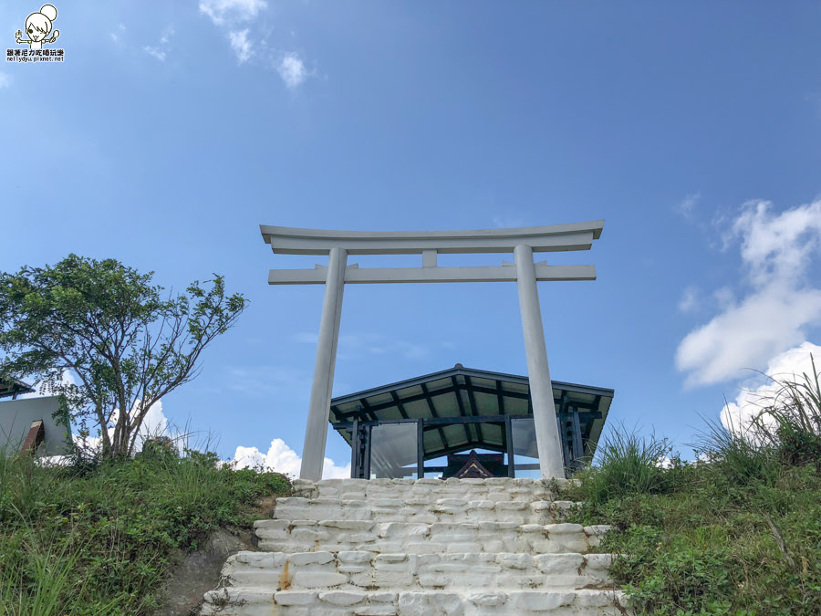 一下子就看到白色鳥居了,搭配綠油油的草地、山景、蔚藍的天,美極了