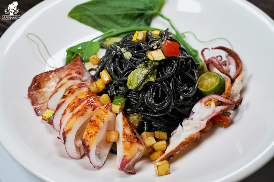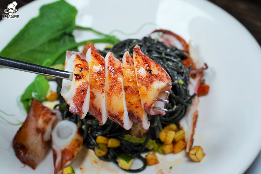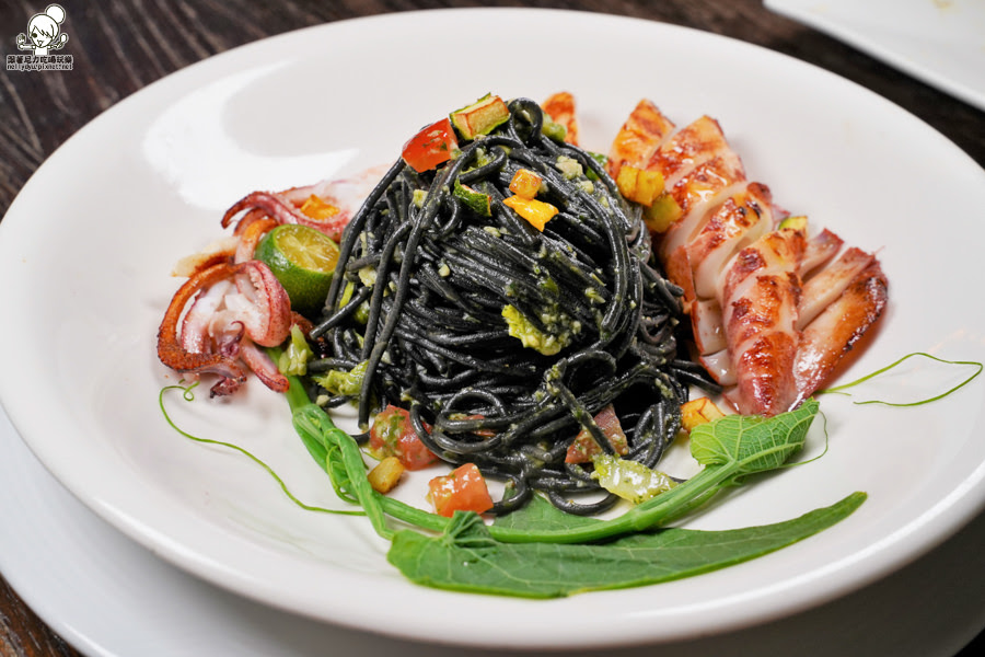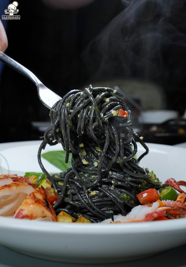 墨魚麵的份量很十足,搭配青醬提味,帶有蒜香氣味