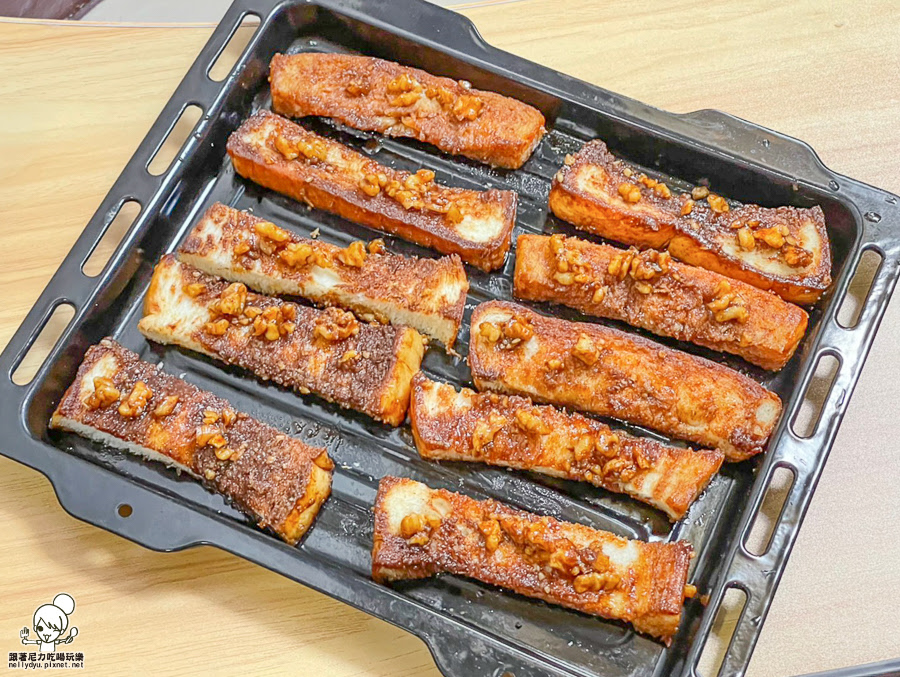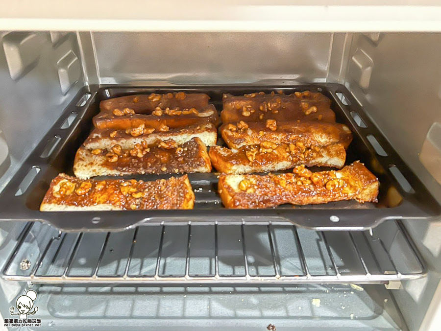 把每一塊吐司都沾上肉桂醬汁,核桃的部分我是用湯匙慢慢的舀起來放上