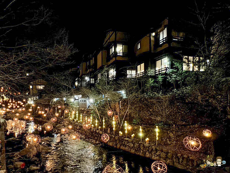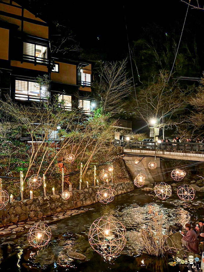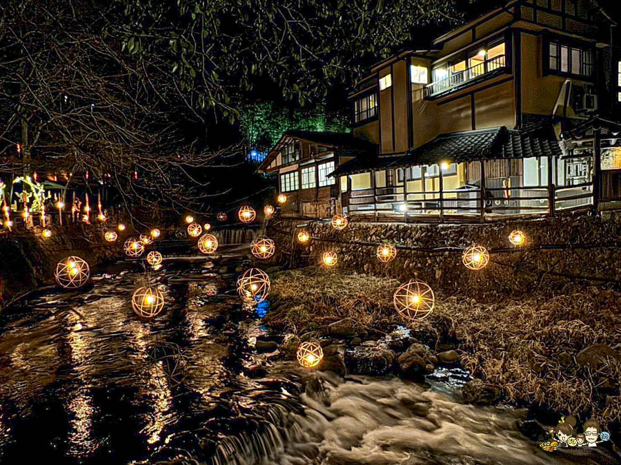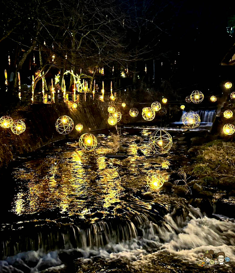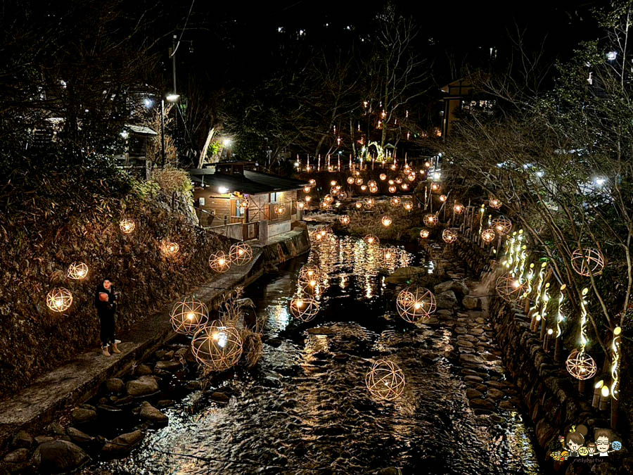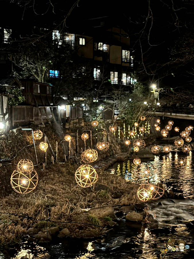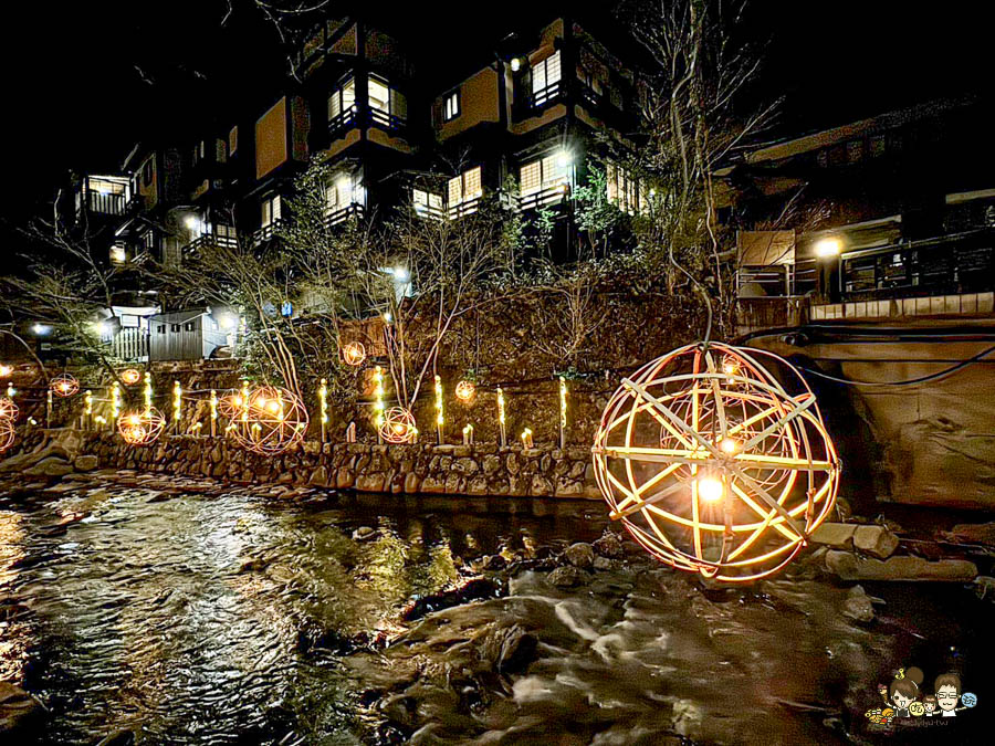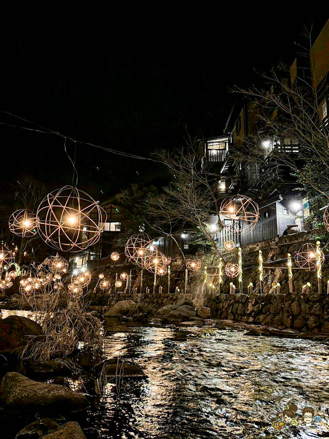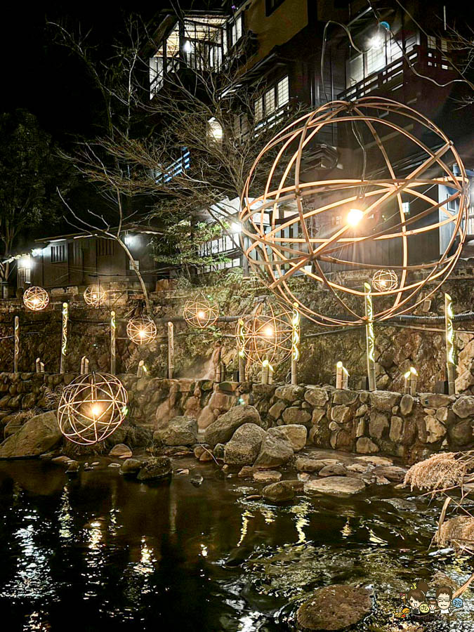 不僅天氣冷適合泡湯,還可以看到浪漫溪流間的竹燈飾點綴,太美了