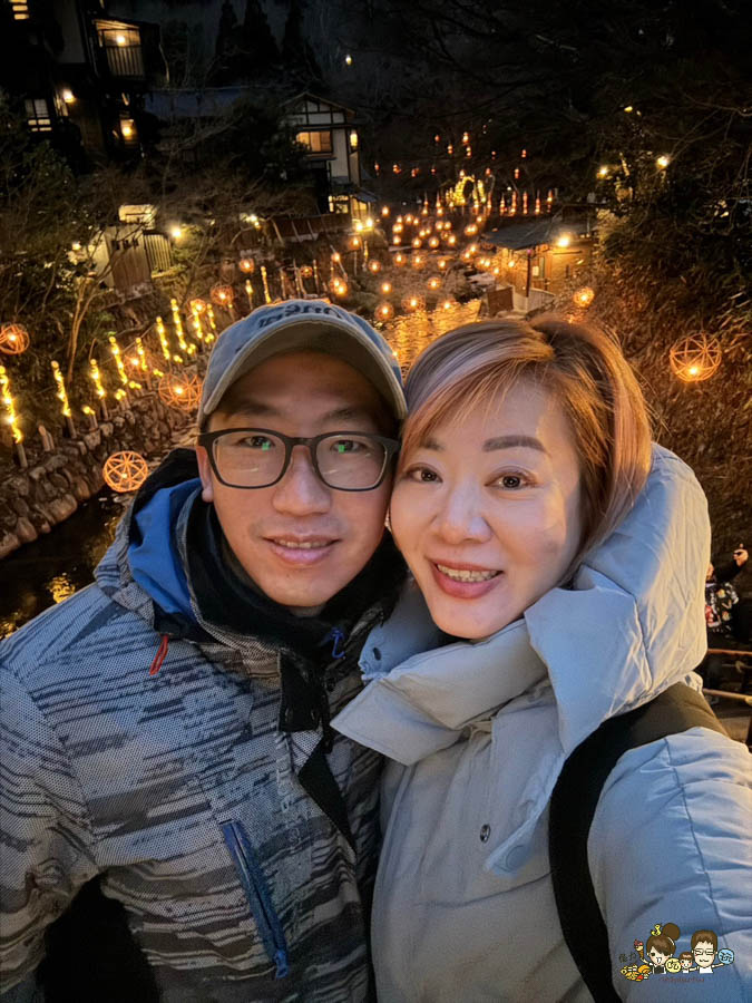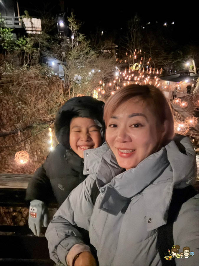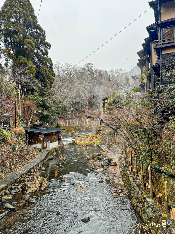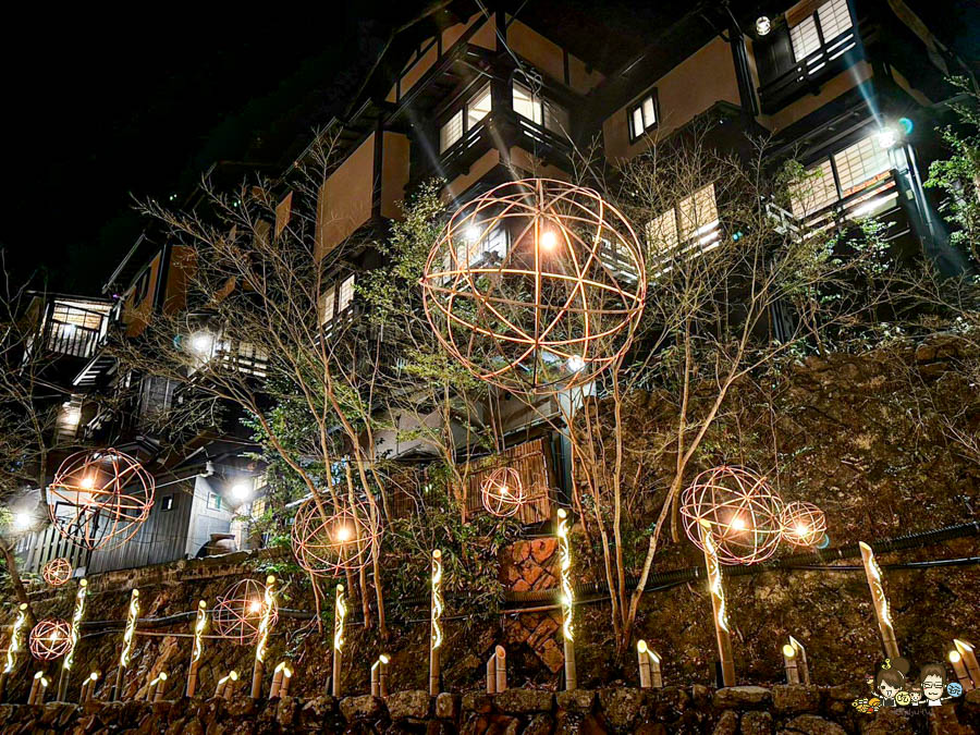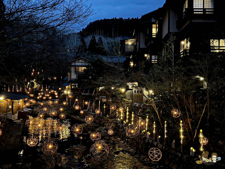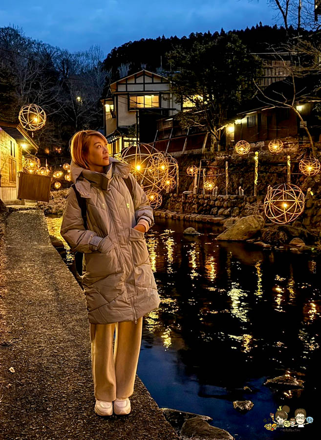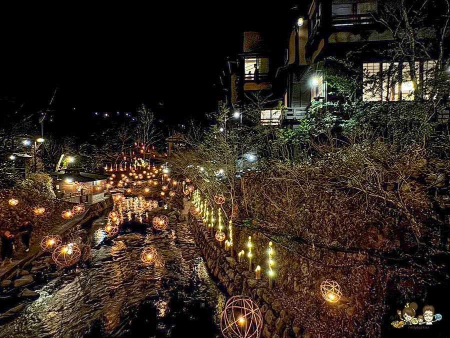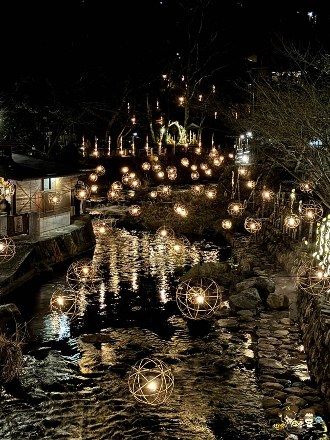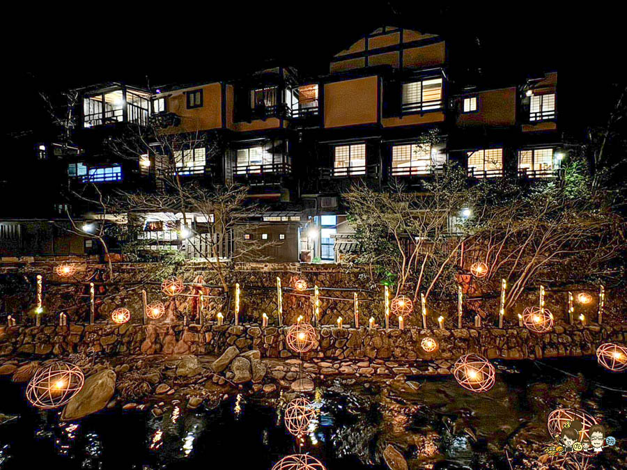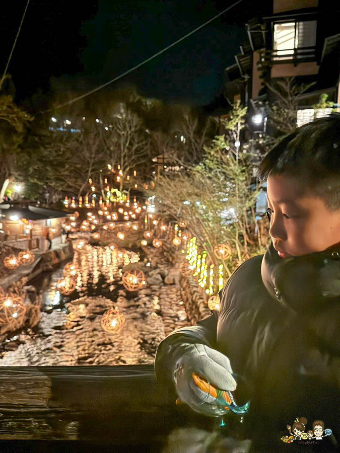 不僅天氣冷適合泡湯,還可以看到浪漫溪流間的竹燈飾點綴,太美了