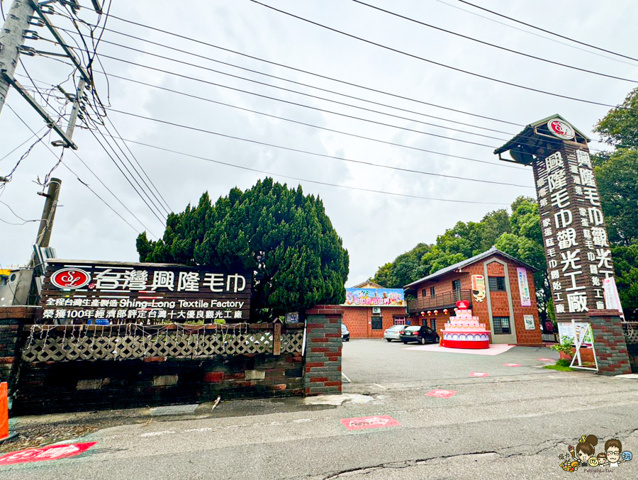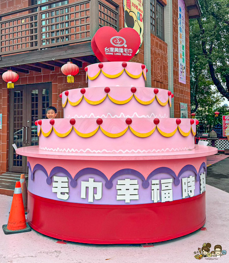 充滿歡樂的興隆毛巾觀光工廠,從門口就有巨型粉色系蛋糕裝置可拍照