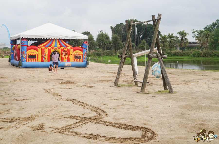 因為這裡有打造人工沙灘,可以奔跑玩樂、暑假還有造型氣墊讓孩子玩耍