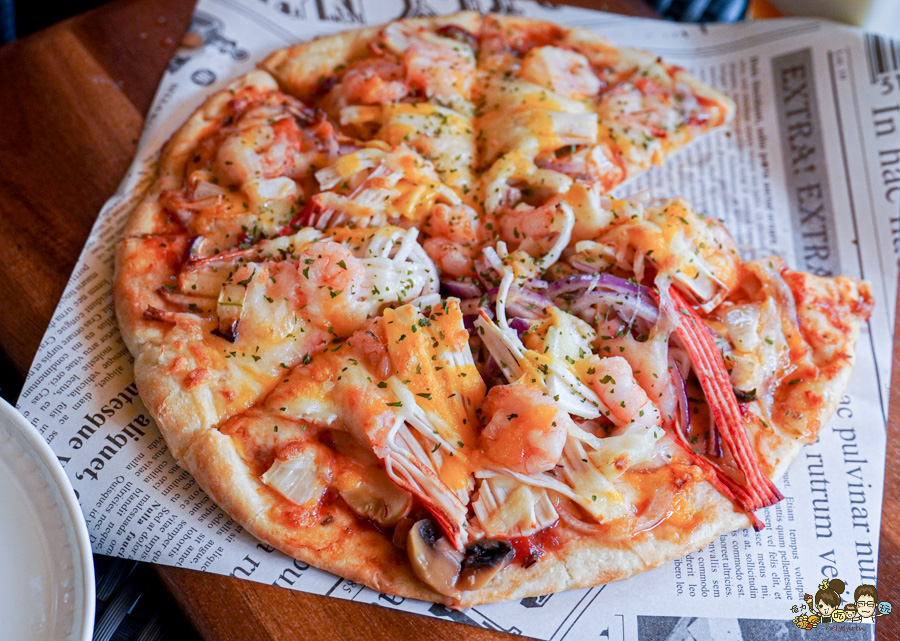 海鮮披薩也是孩子的愛,料很多~~每一口都很豐富!