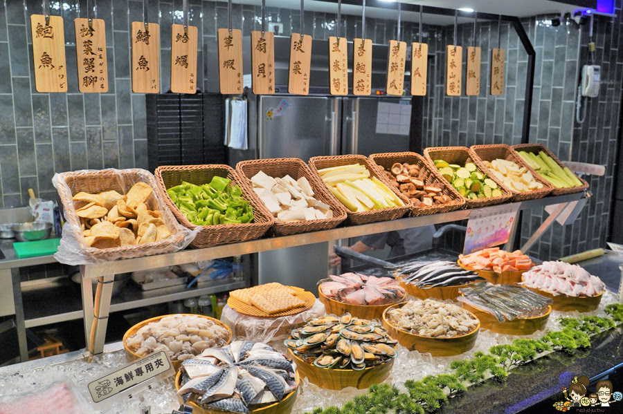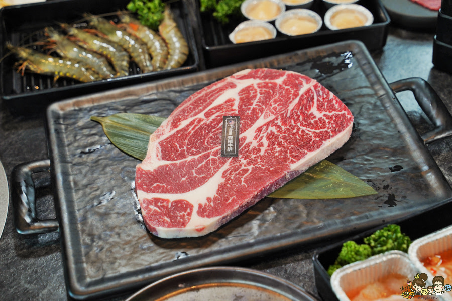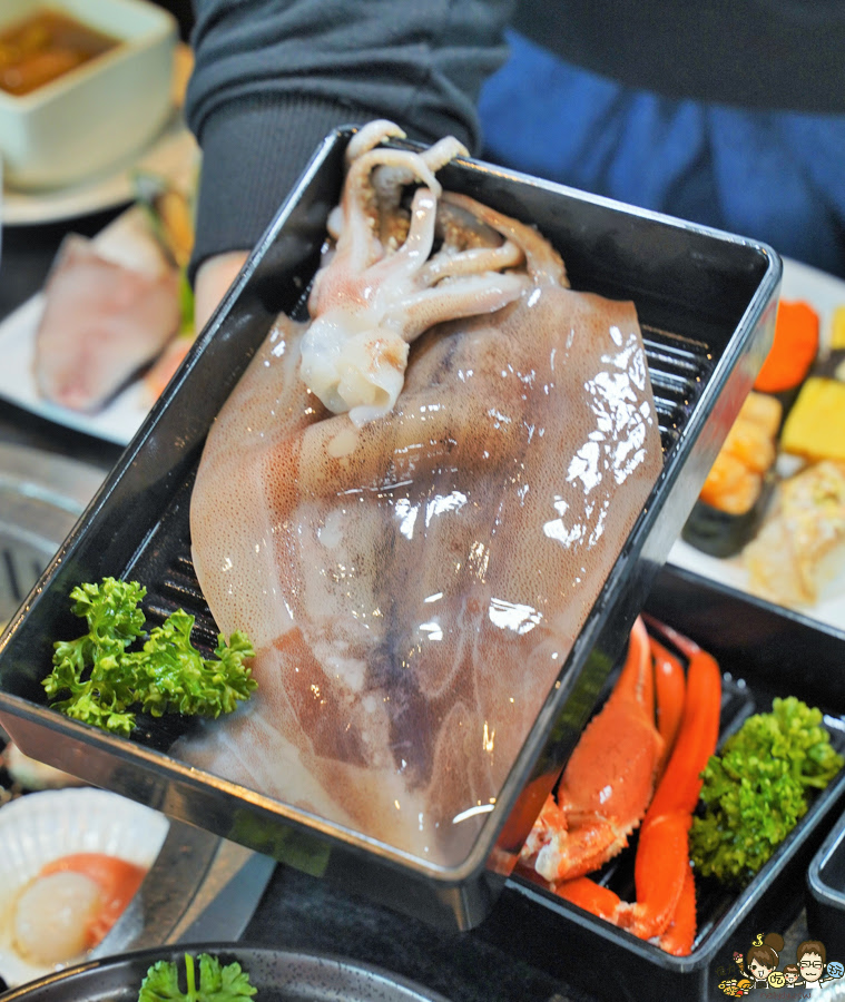 記得點和牛、現切原塊肉、松葉蟹腳、干貝、鮑魚、天使紅蝦、巨大深海魷魚等食材